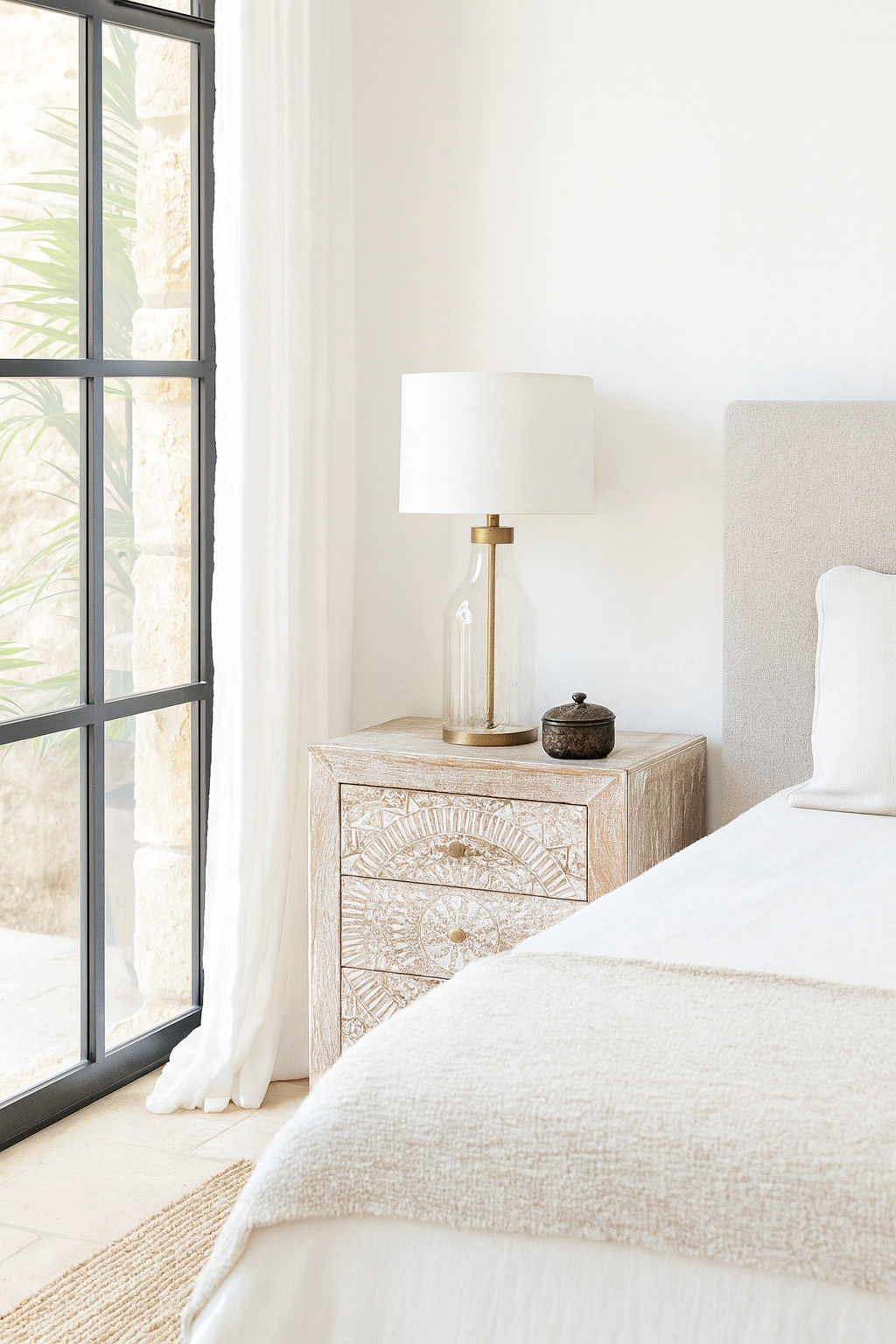 The Kalli bedside tables bring artisanal elegance and timeless character into your home. This handcrafted set of two hand carved night stands, made from solid mango wood, showcases intricate mandala-inspired patterns finished in a soft whitewash. The detailing highlights the wood’s natural texture, making them standout pieces of white washed furniture that balance warmth with serenity.
