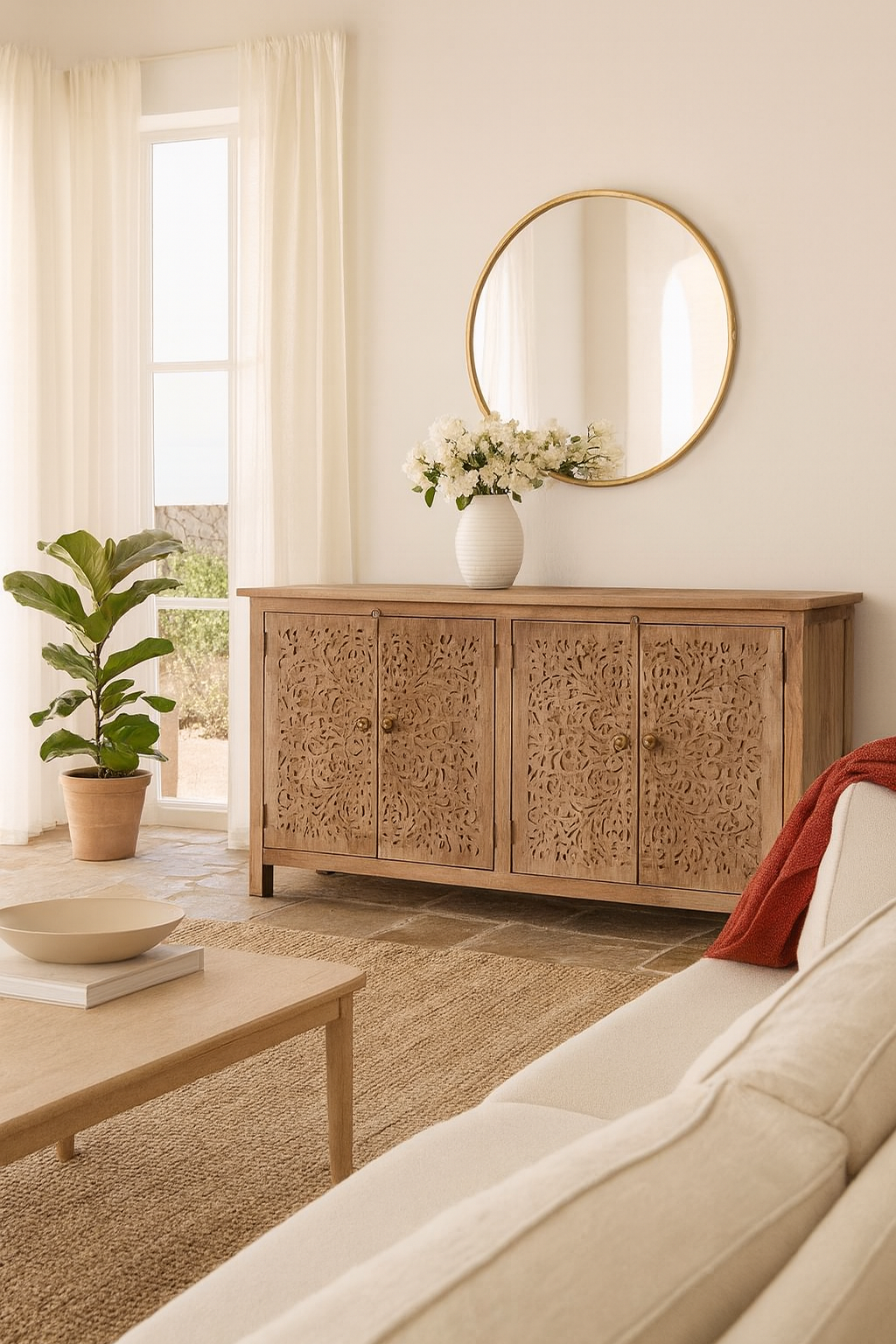 - Mediterranean Style: The Mediterranean living style is characterized by natural elegance and a relaxed flair. An oriental mango wood sideboard can serve here as a central eye-catcher. Combined with terracotta tiles, sand-colored walls, and maritime decor, the warm wood tones are particularly effective.