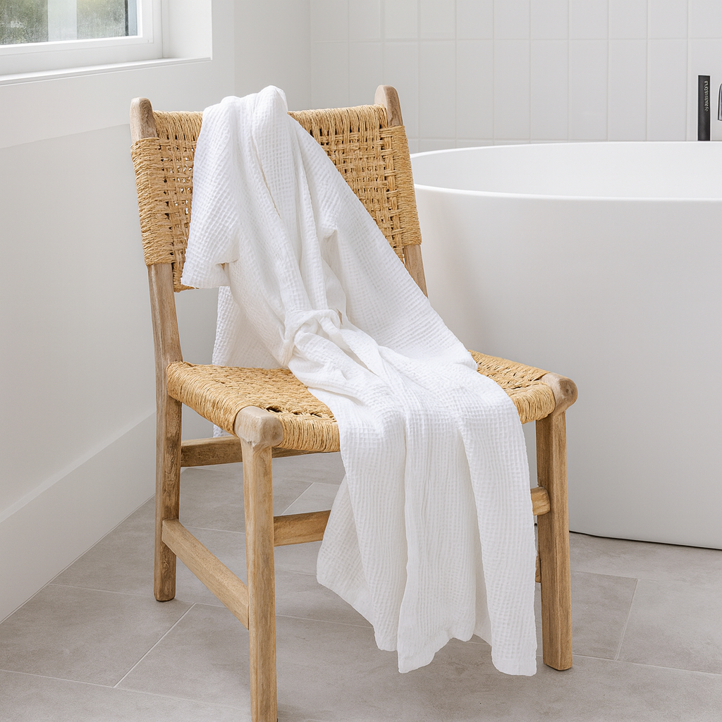 The handwoven natural weed canopy and upholstered seat add texture and comfort, while the solid recycled wood frame provides durability and rustic character. With its light, airy aesthetic and laid-back design, this chair is perfect for bohemian, coastal, or rustic interiors inspired by the easy elegance of Ibiza living.