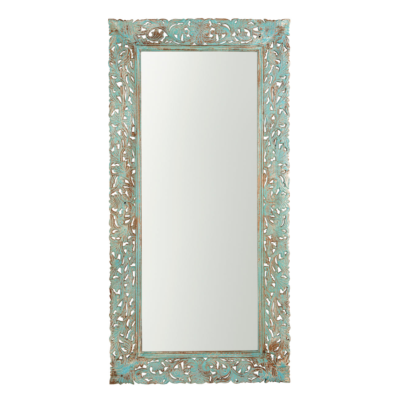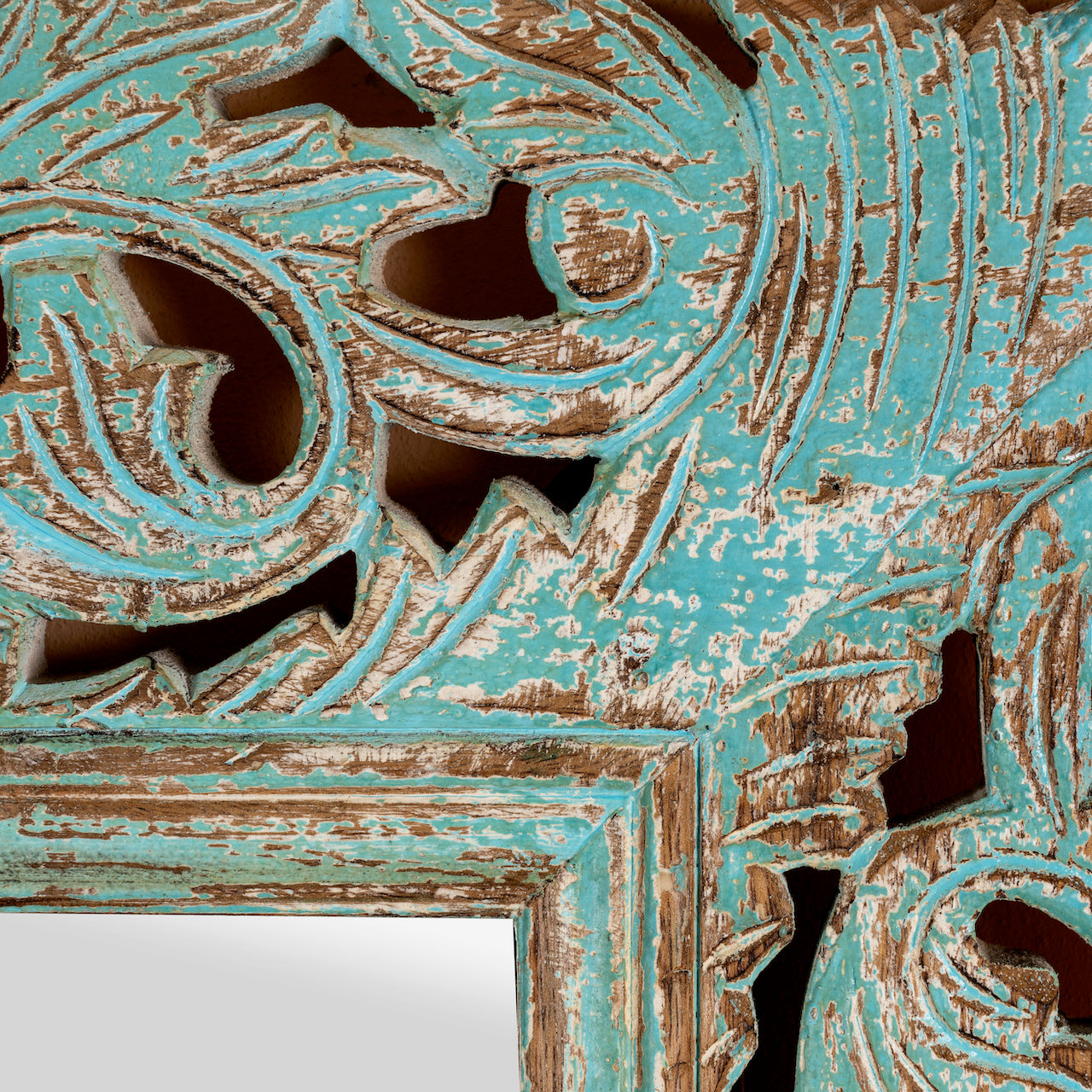 Introducing the Apsara mirror, a stunning piece of Indian craftsmanship. This mirror comes in a beautiful turquoise color and is adorned with intricate hand-carved engravings that highlight the skill of Indian artisans. This mirror adds both a pop of color and a touch of Indian culture to your living space.