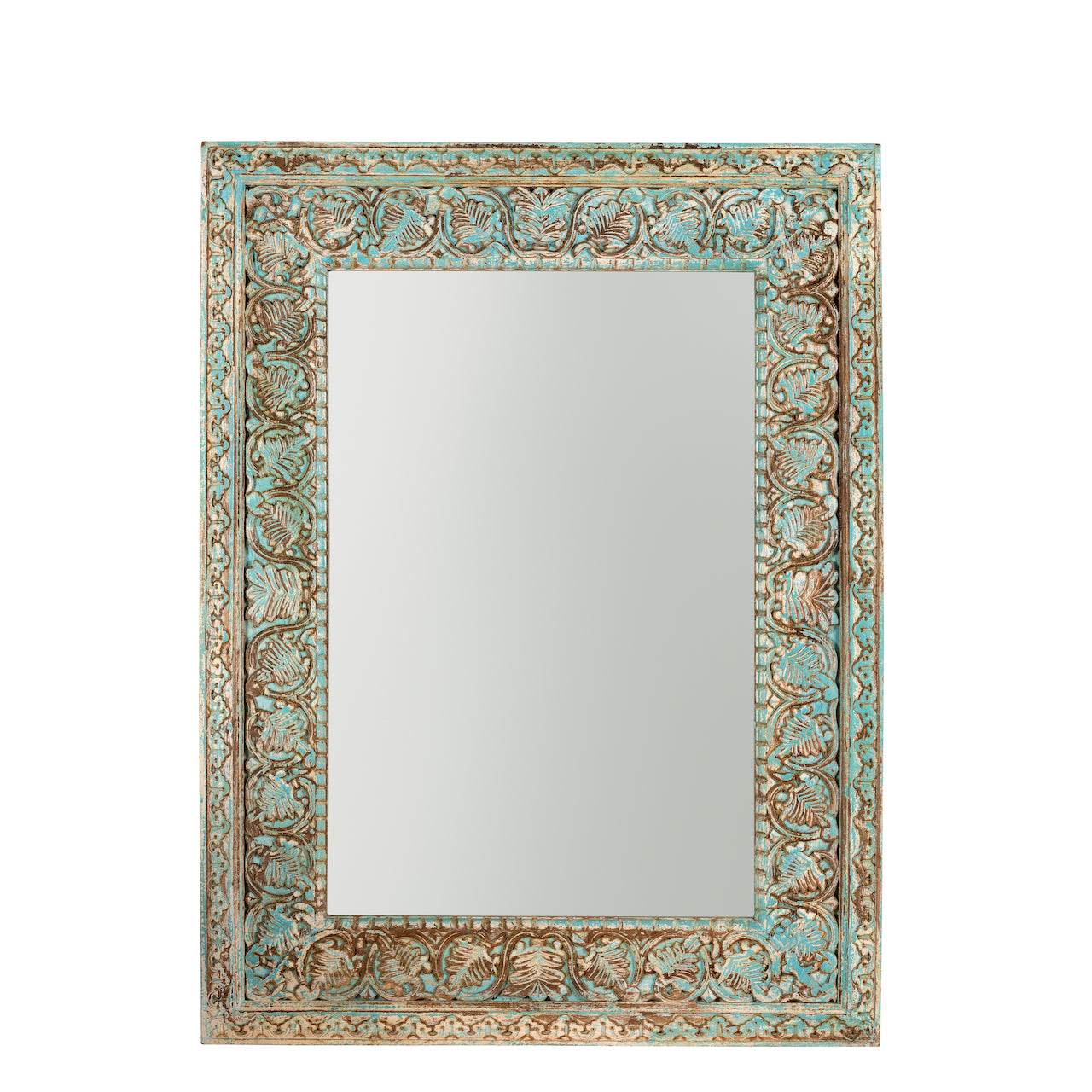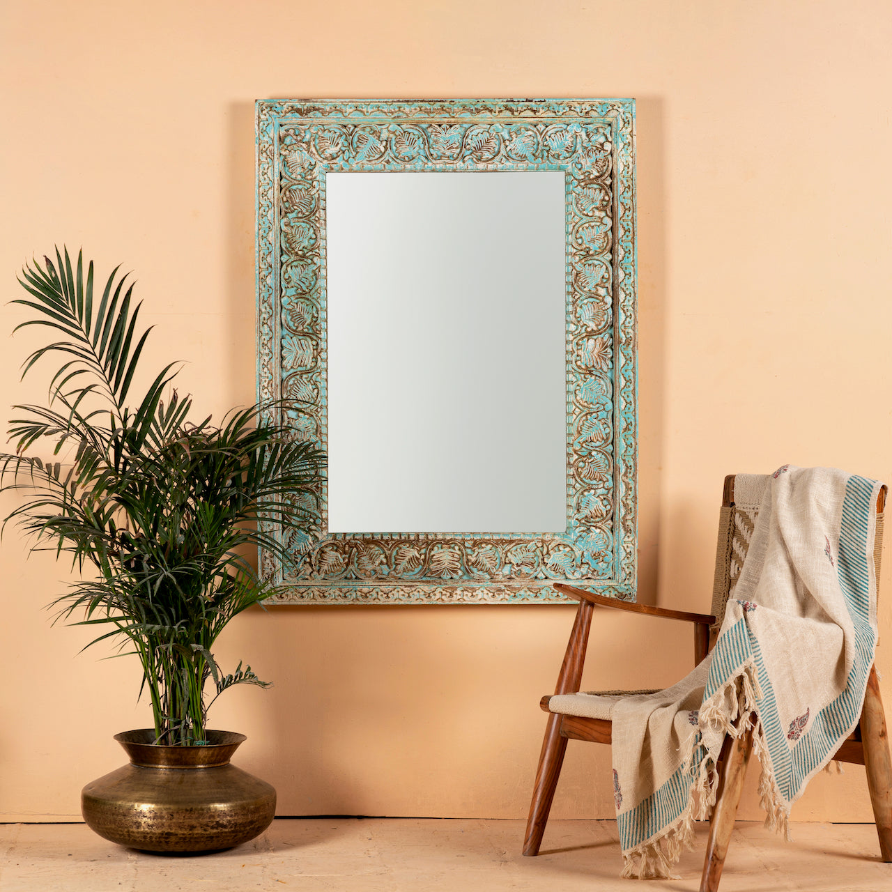 Introducing the Anuvinda mirror, a stunning piece of Indian craftsmanship. This mirror features a beautiful turquoise color and is adorned with intricate hand-carved engravings that highlight the skill of Indian artisans. This mirror adds both a pop of color and a touch of Indian culture to your living space.
