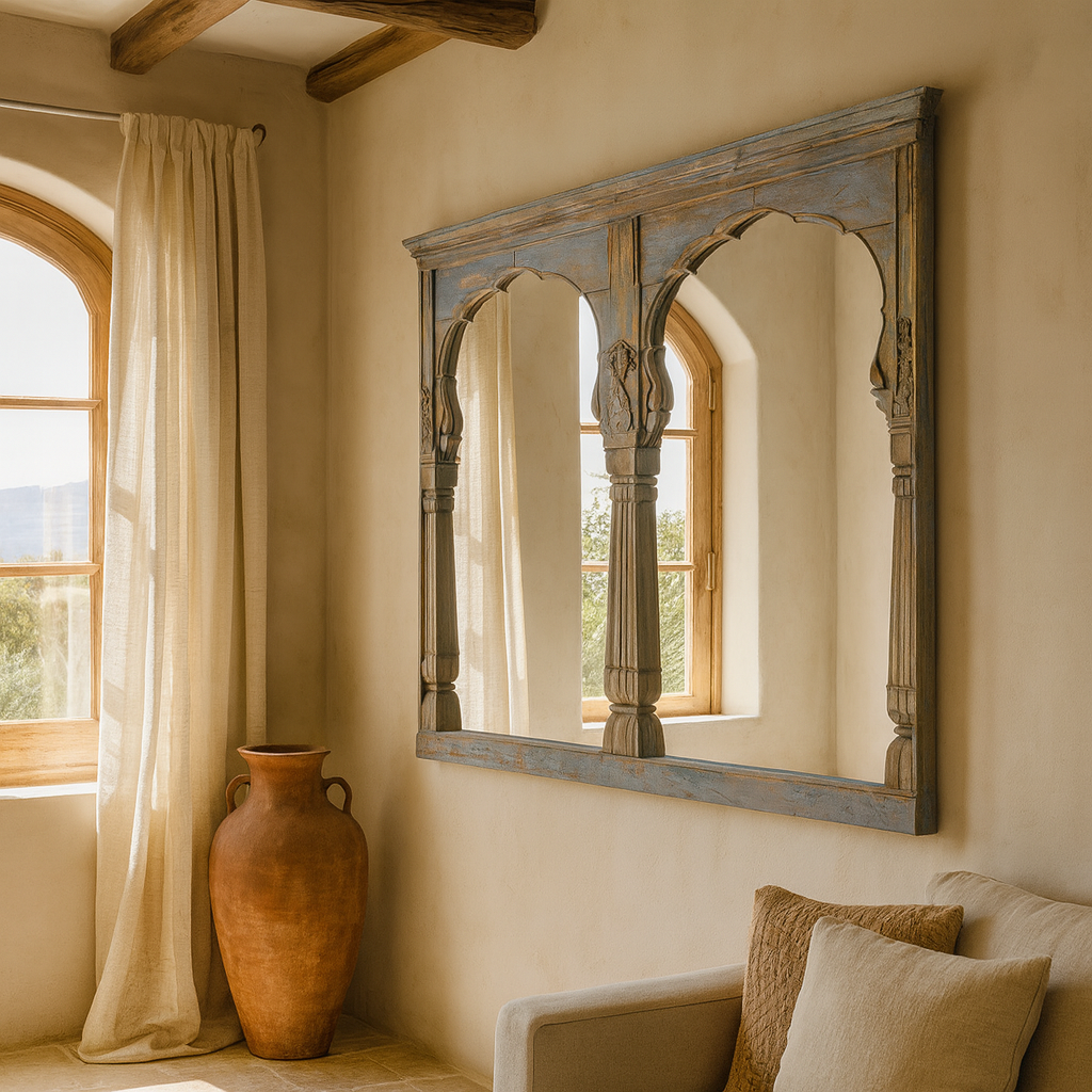 The three softly scalloped arches are framed by carved columns, each marked with time-worn texture and artisan detailing. Whether placed above a console, in a hallway, or as a statement in a boho chic living room, this mirror reflects both light and history with subtle presence.