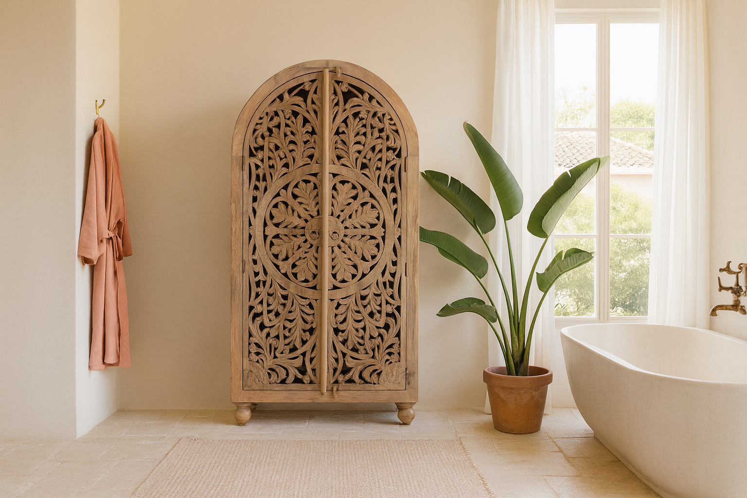 Elevate your bedroom with this hand-carved wooden wardrobe, a striking example of unique furniture that merges global inspiration with masterful craftsmanship. Made from solid mango wood, this piece features an elegant arched silhouette and intricate floral carvings that pay homage to the rich artistic traditions of Ibiza, the Mediterranean, and Moroccan design.