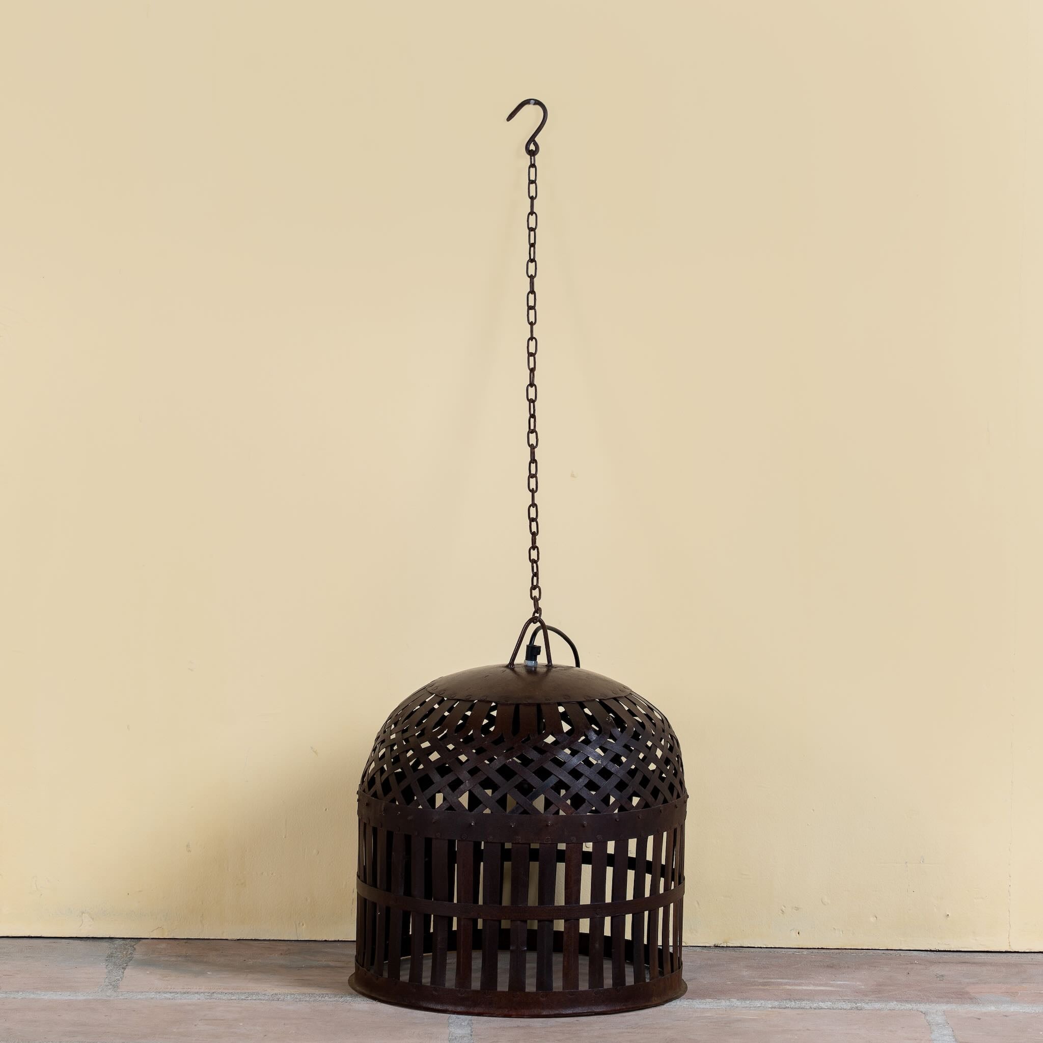 Its dome-shaped form is composed of finely hand-forged metalwork with a lattice pattern that diffuses light in striking ways. As part of our curated collection of metal pendant lights, Chahna embodies the beauty of imperfection and artisan detailing in every angle.