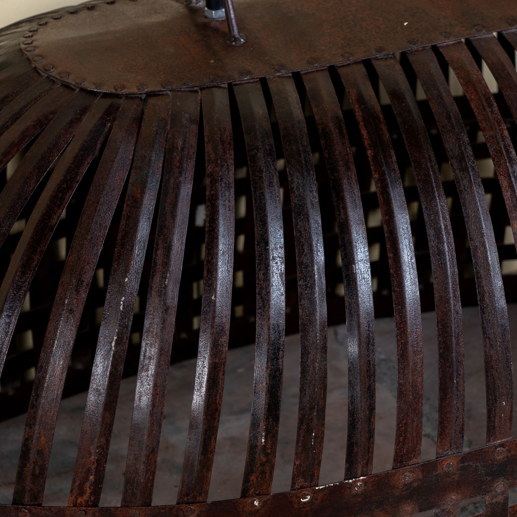 Design: Domed pendant structure with woven base and vertical slat detailing