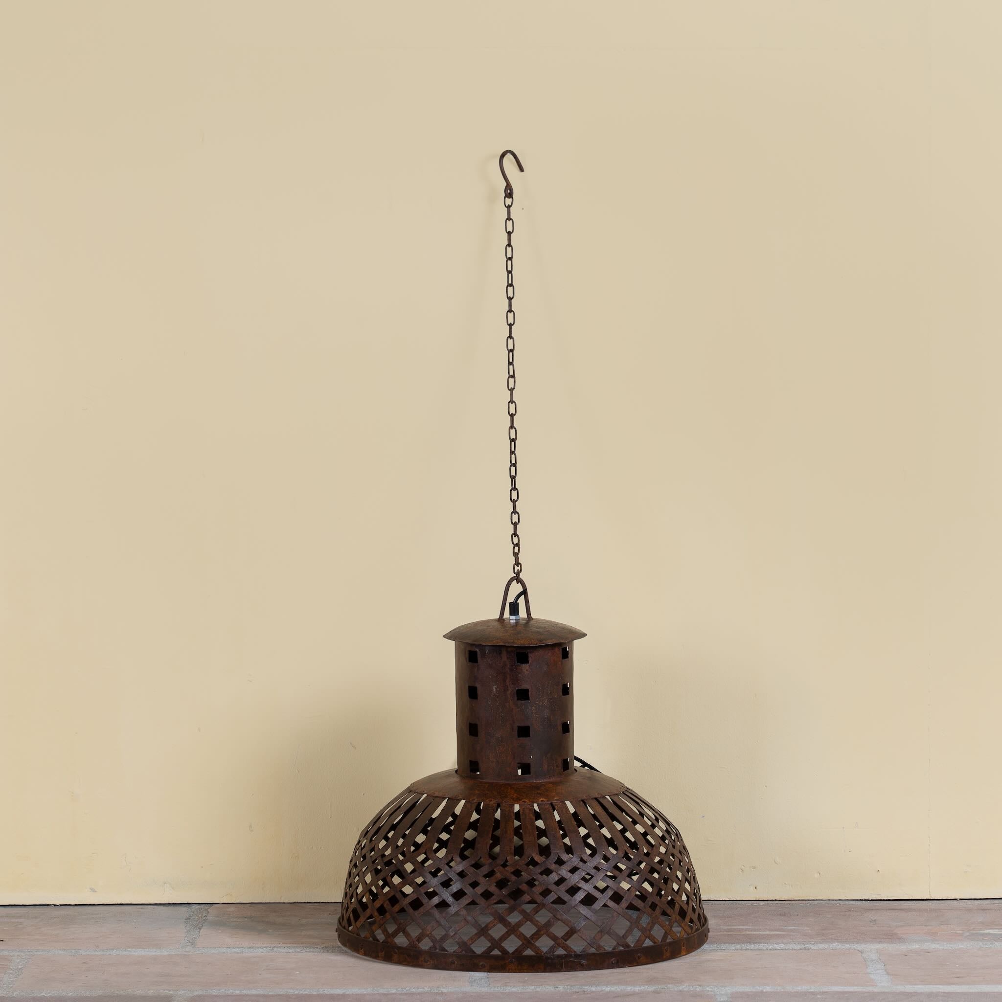 Its wide dome is hand-forged in a detailed lattice pattern, while the tall ventilated top section adds a distinctive silhouette. As part of our collection of metal pendant lights, Daya reflects the essence of hand crafted metal lamps—bold, functional, and rich with texture.