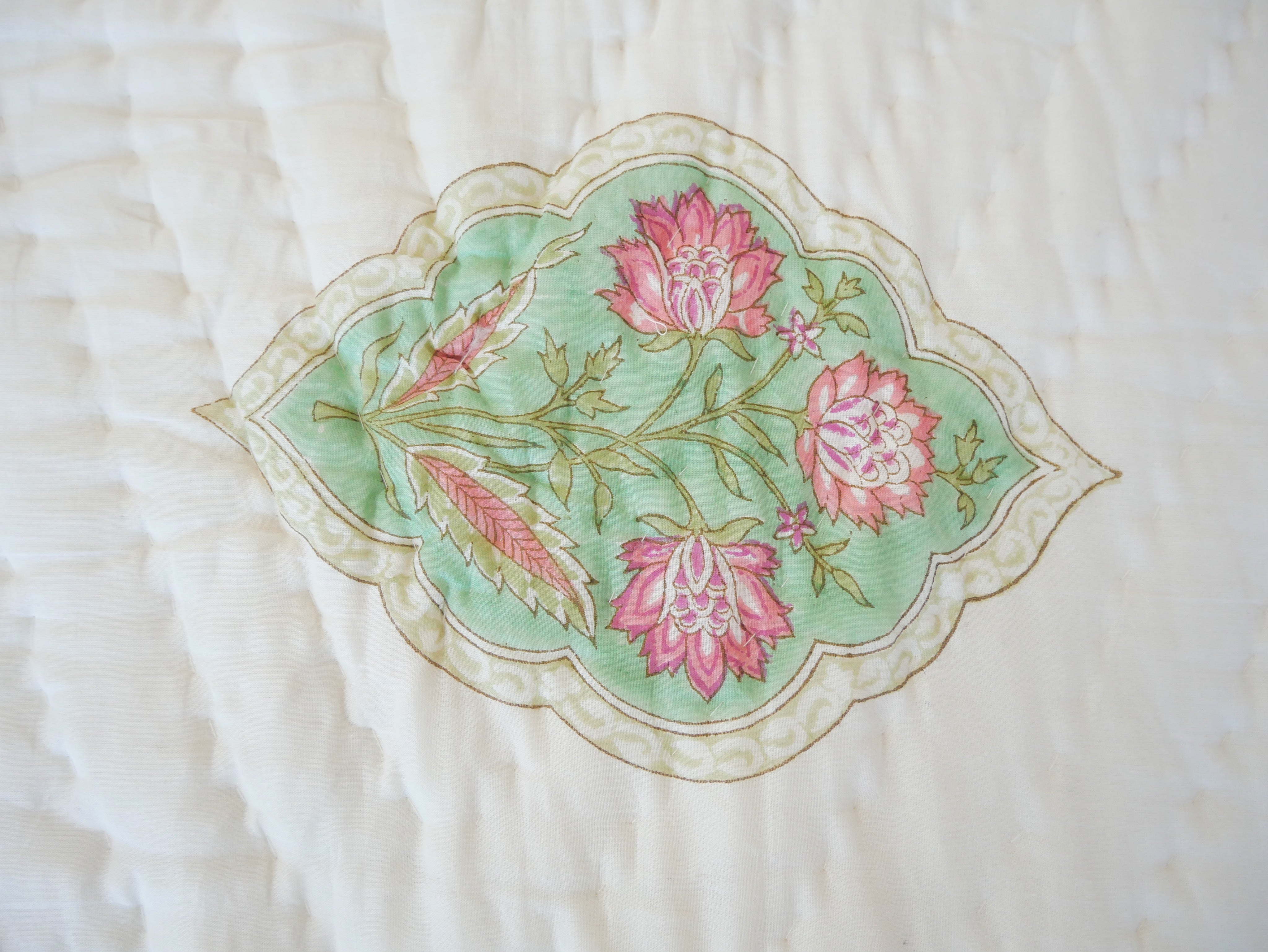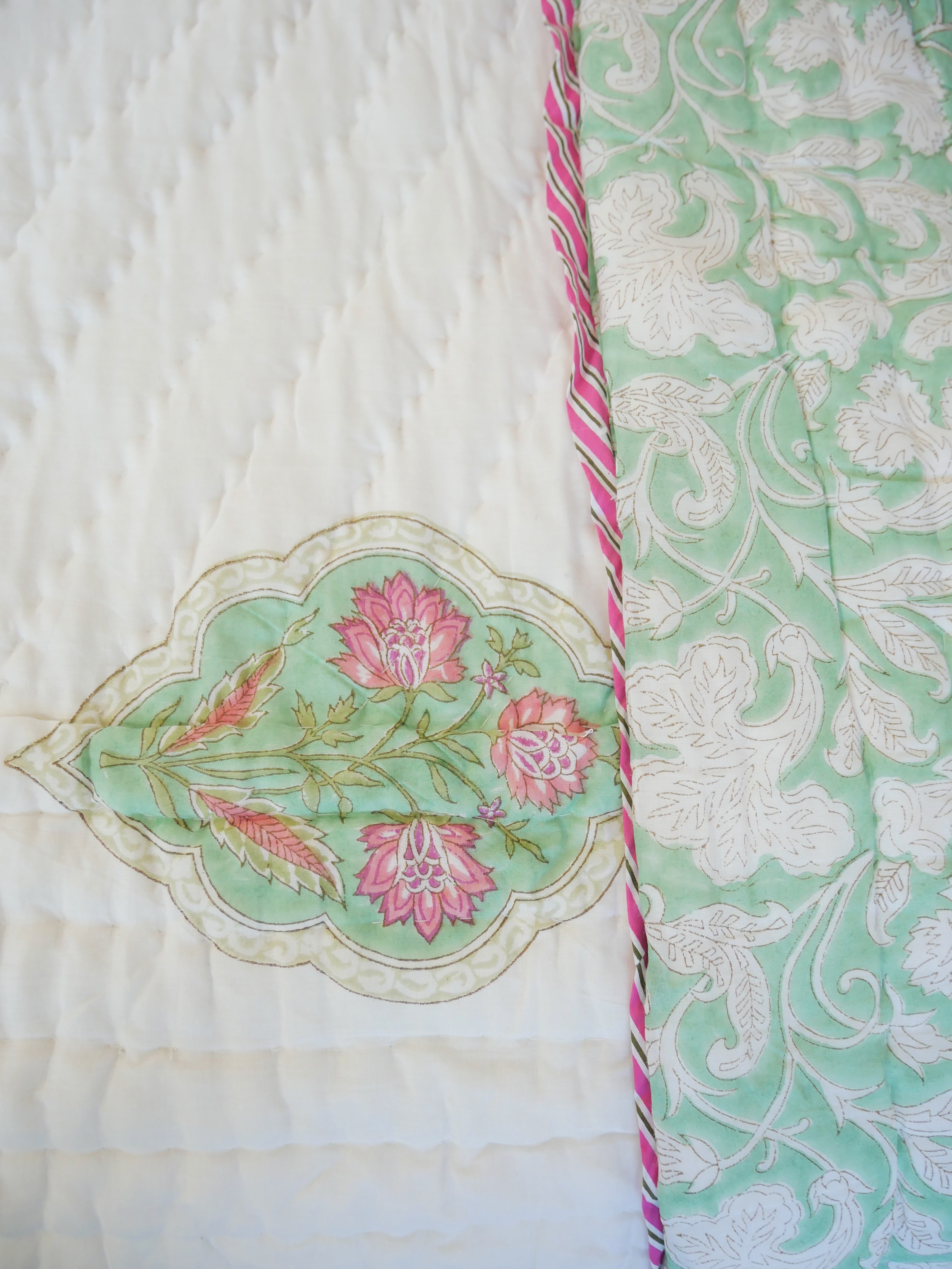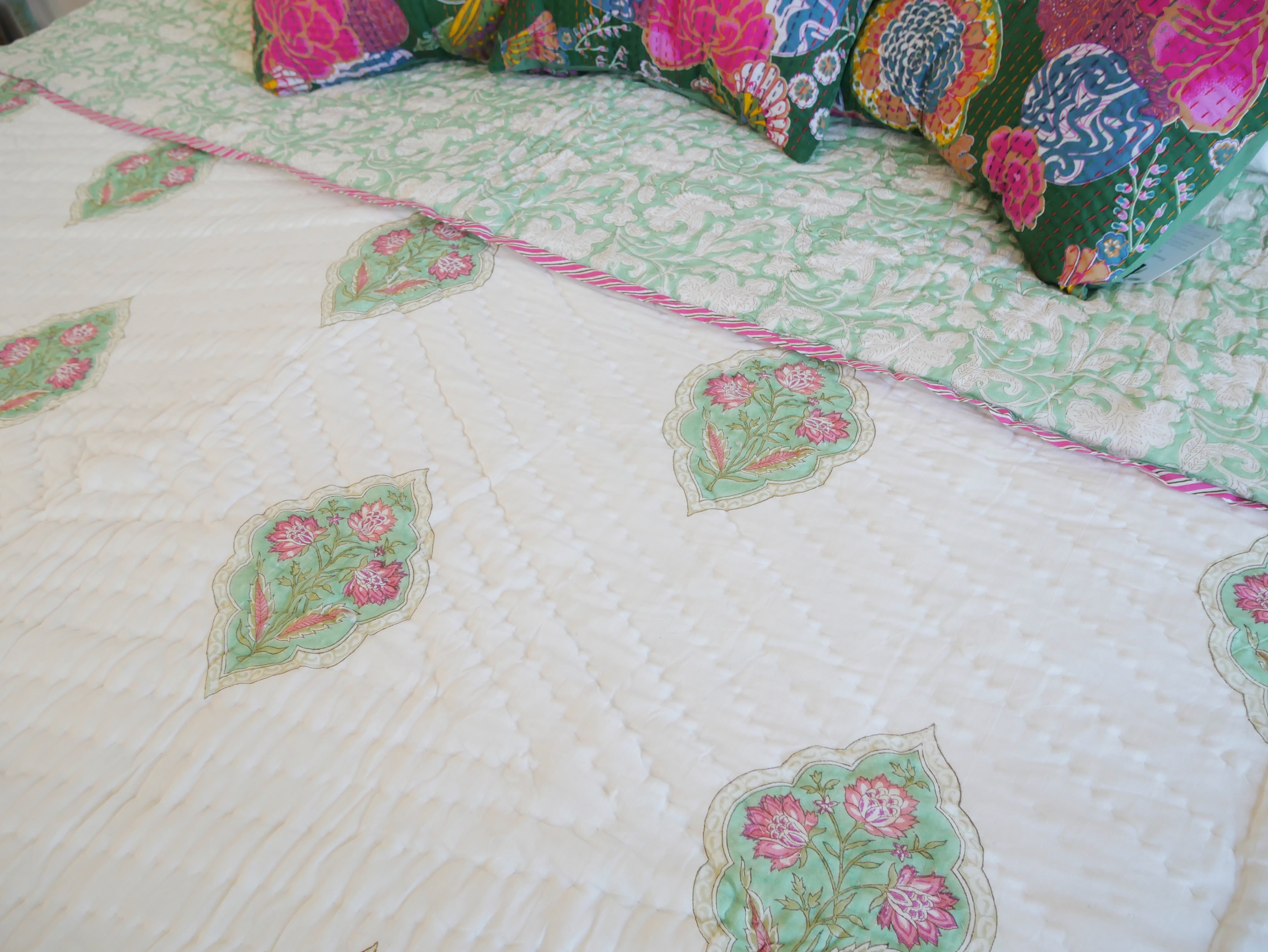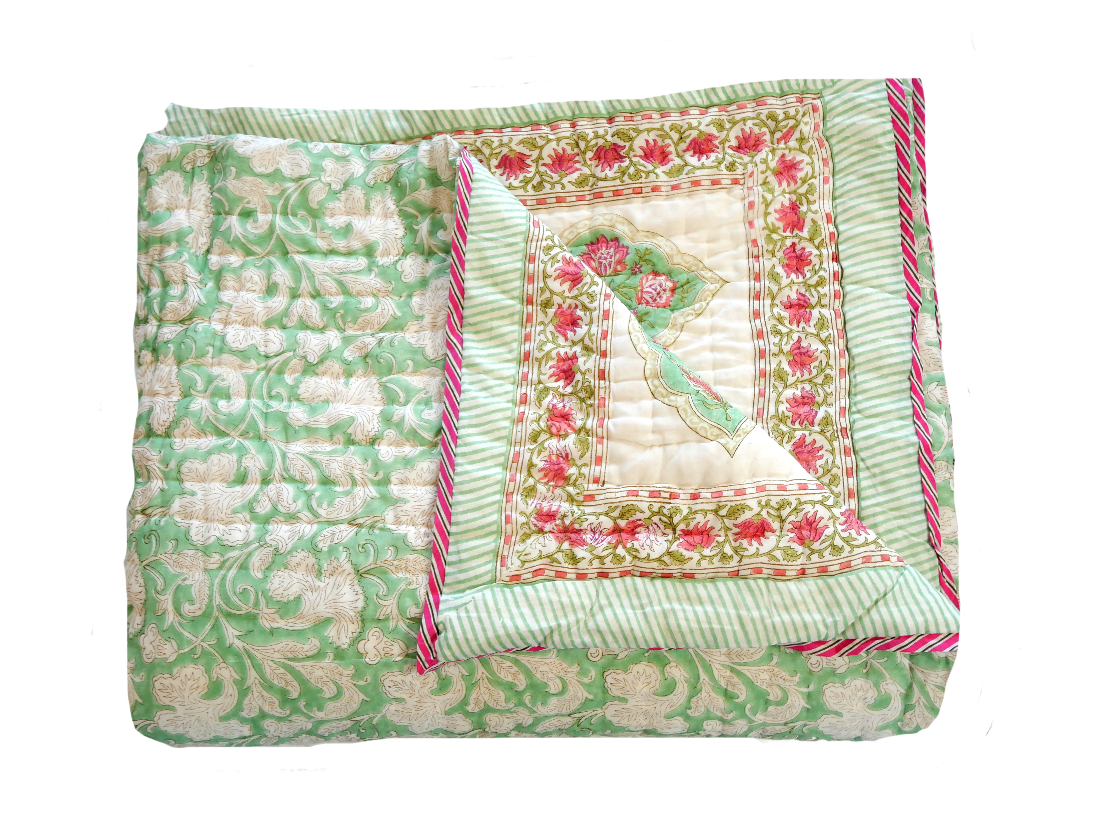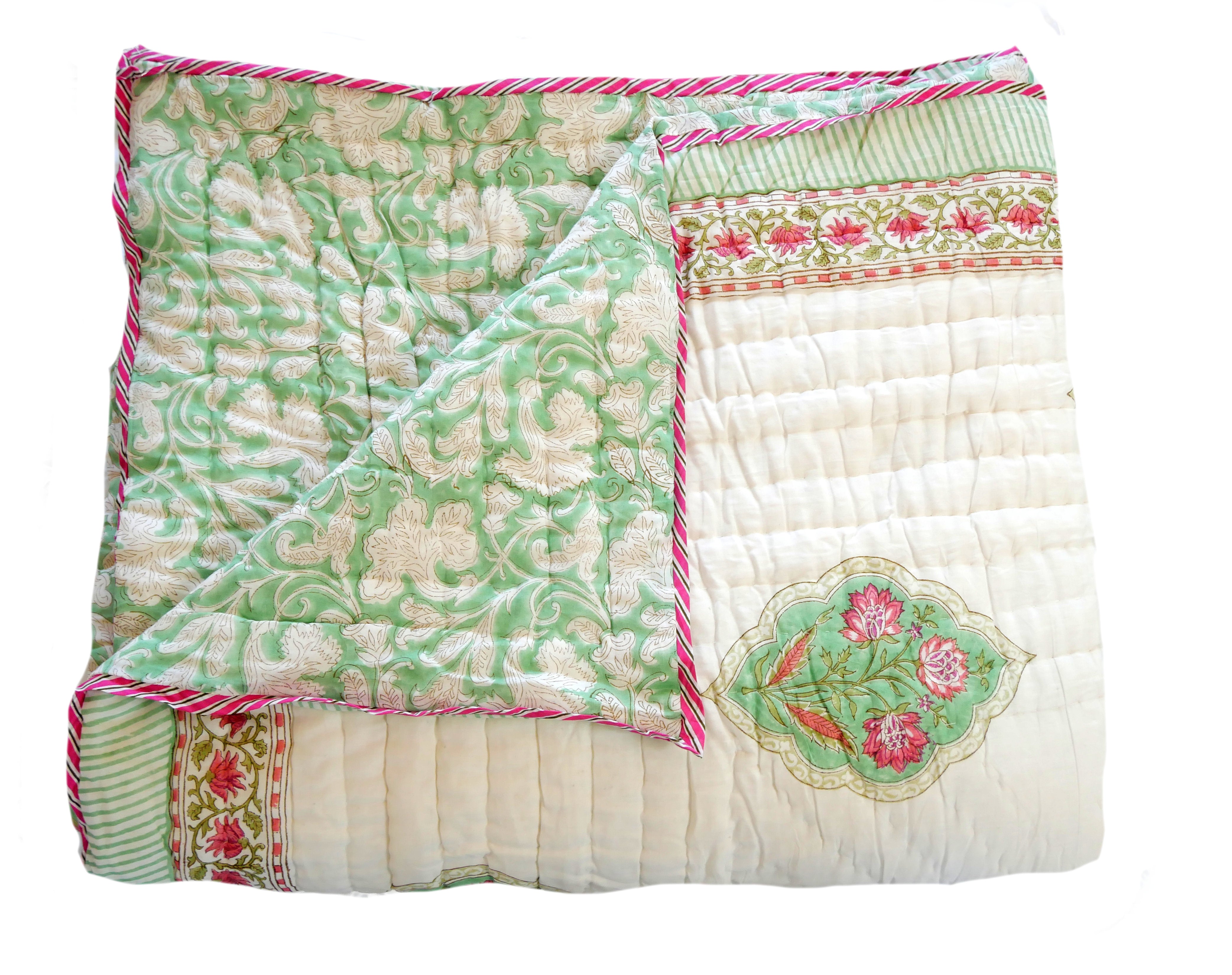 The quilt is elaborately hand printed on both sides in various patterns in typical designs from Rajasthan and can therefore be rotated as shown in our photos.
