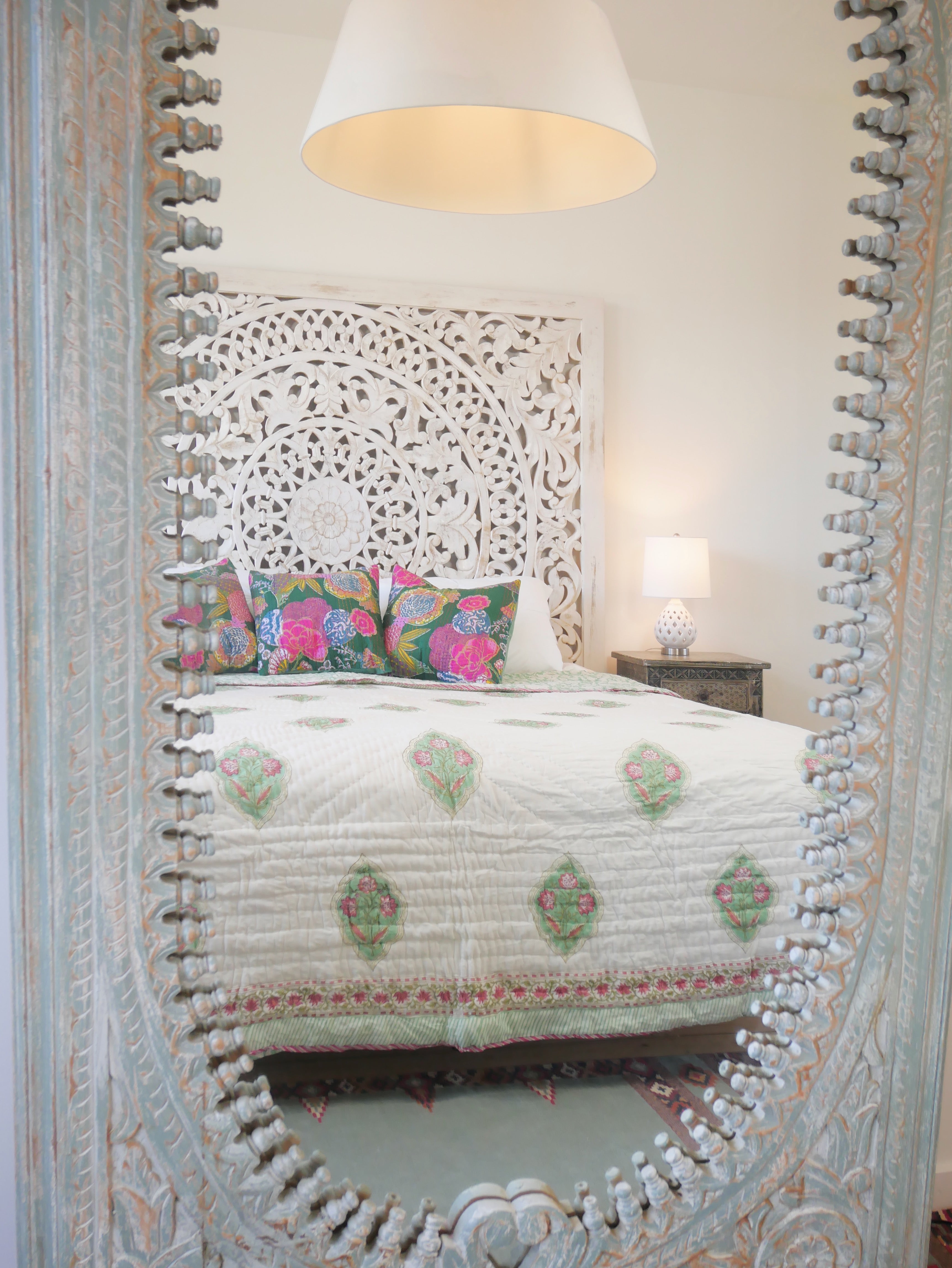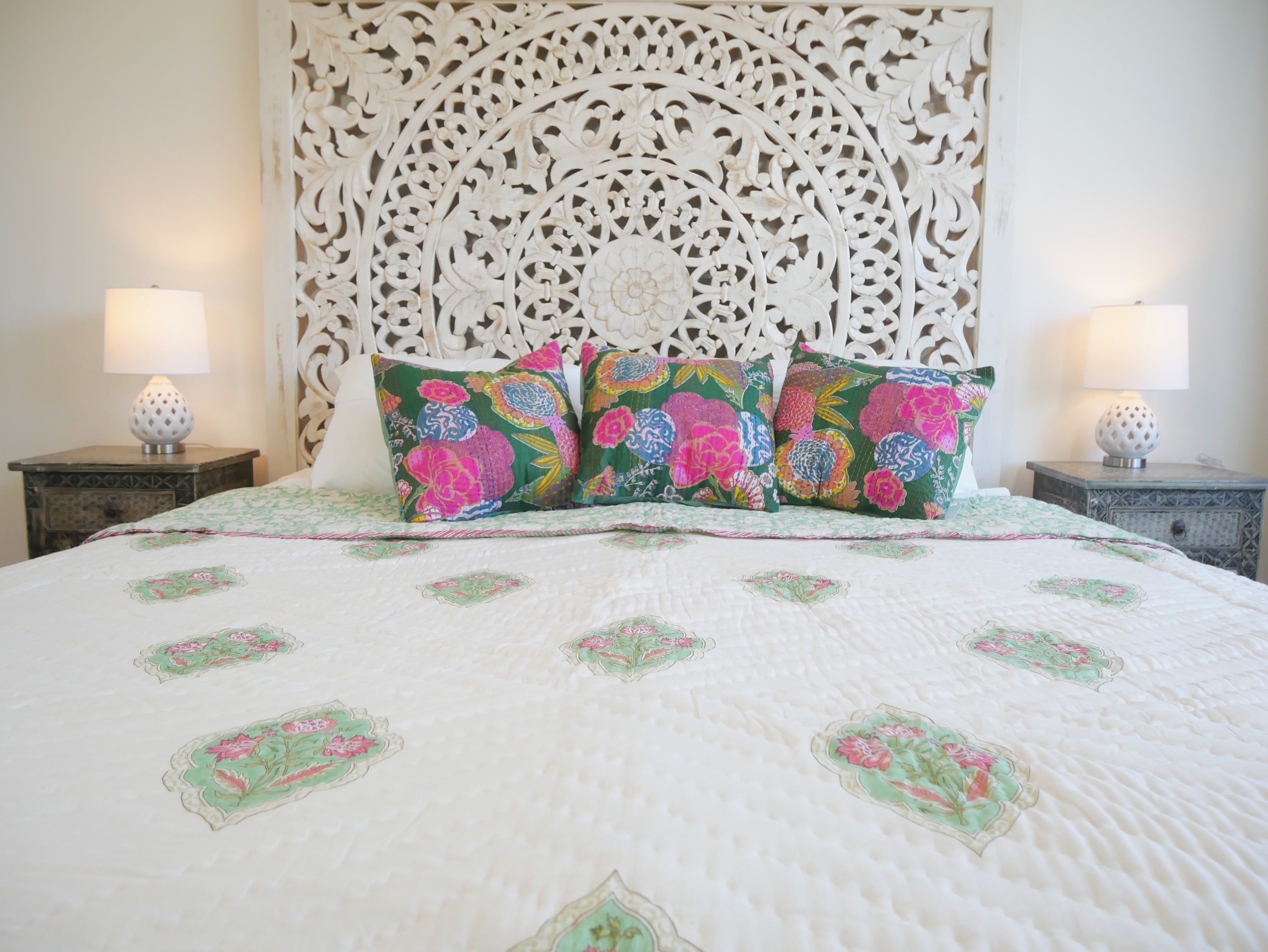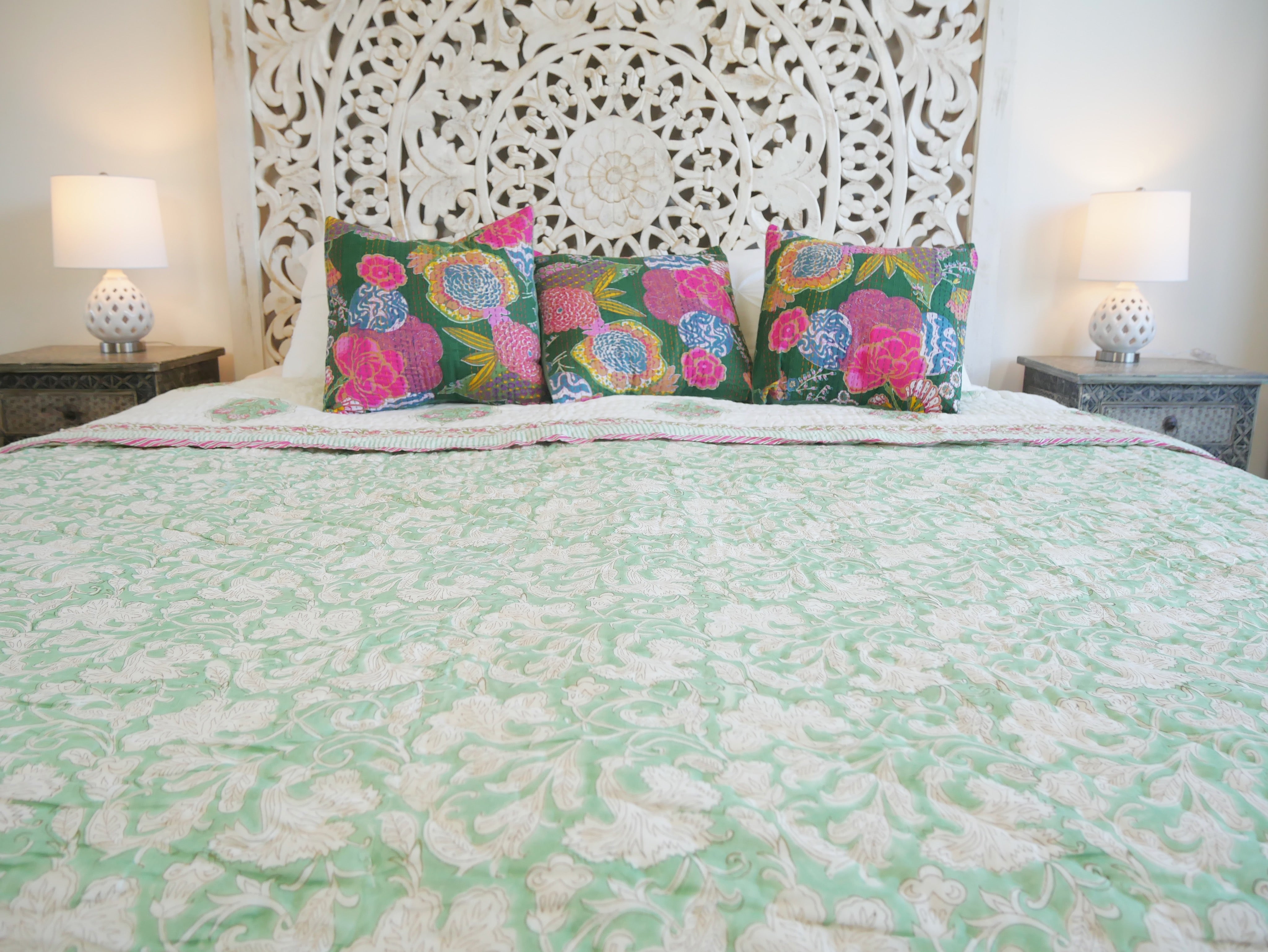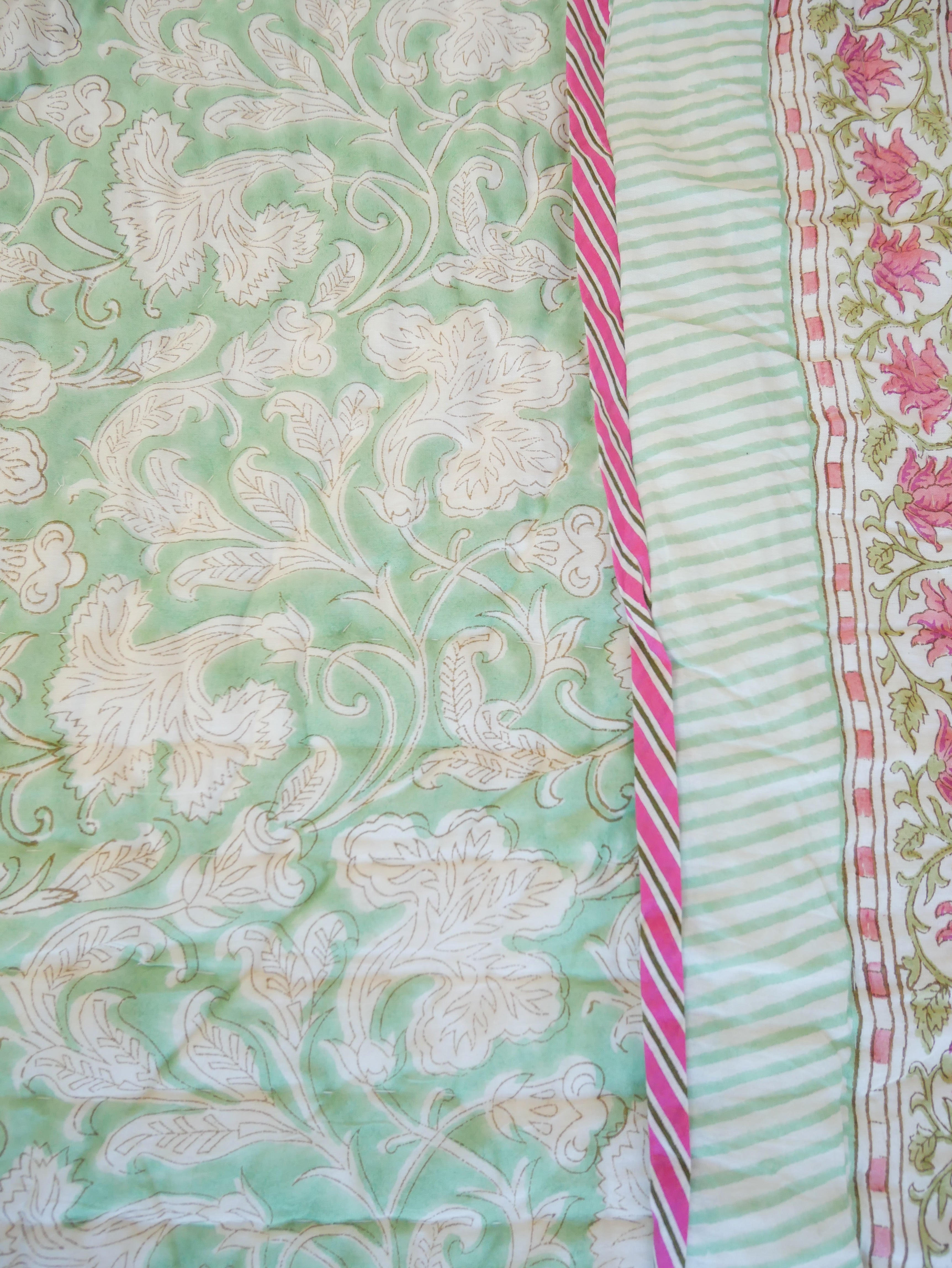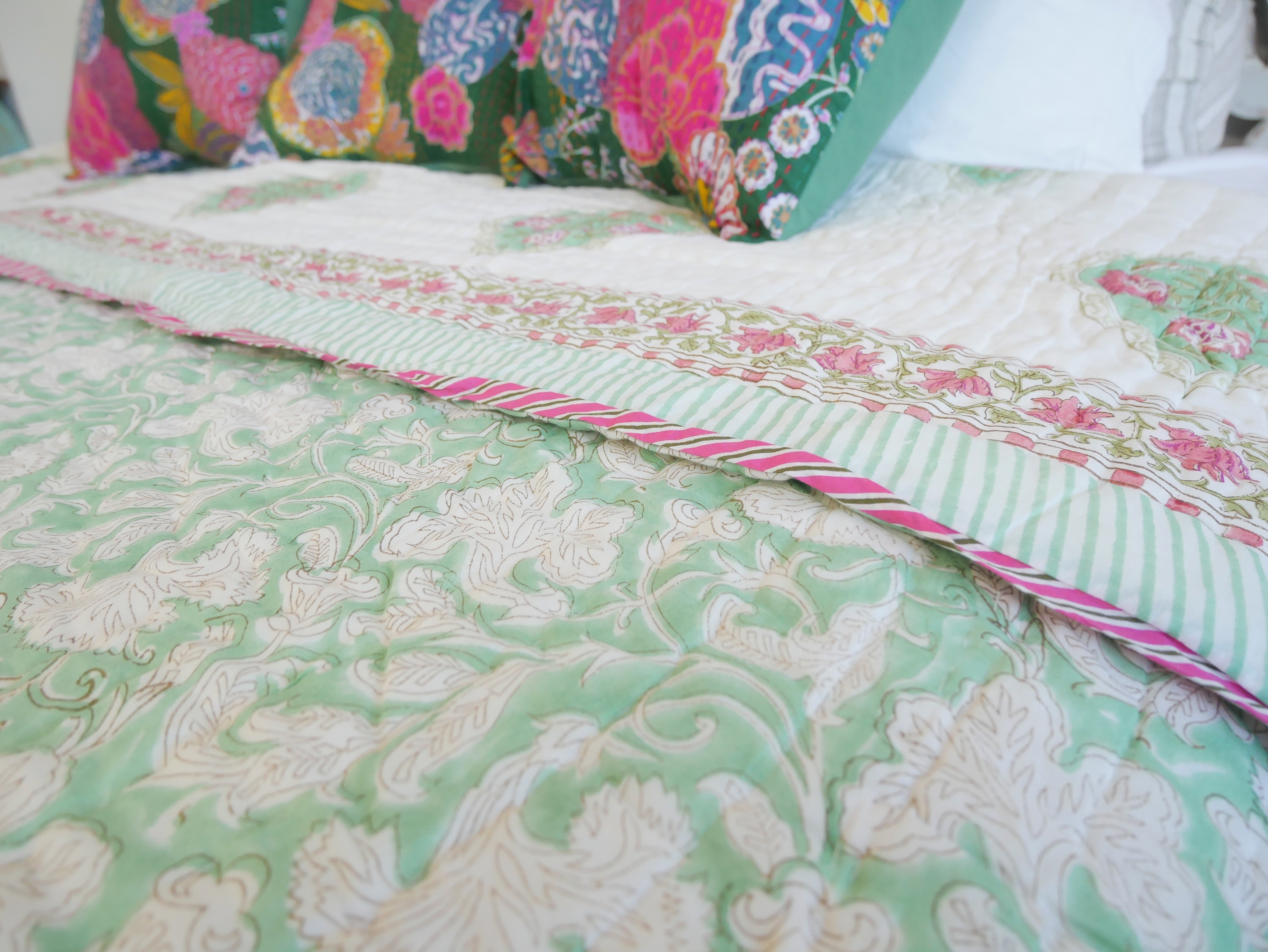 The quilt is elaborately hand printed on both sides in various patterns in typical designs from Rajasthan and can therefore be rotated as shown in our photos.