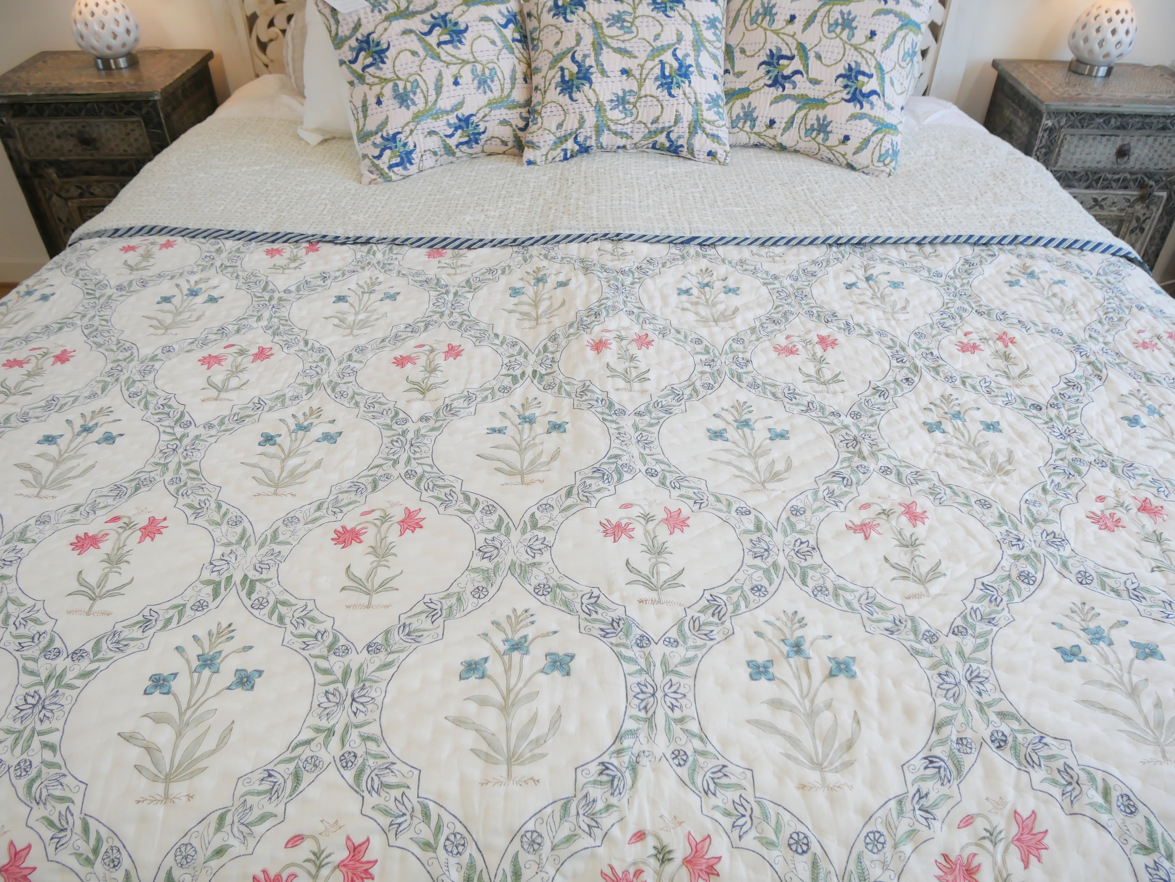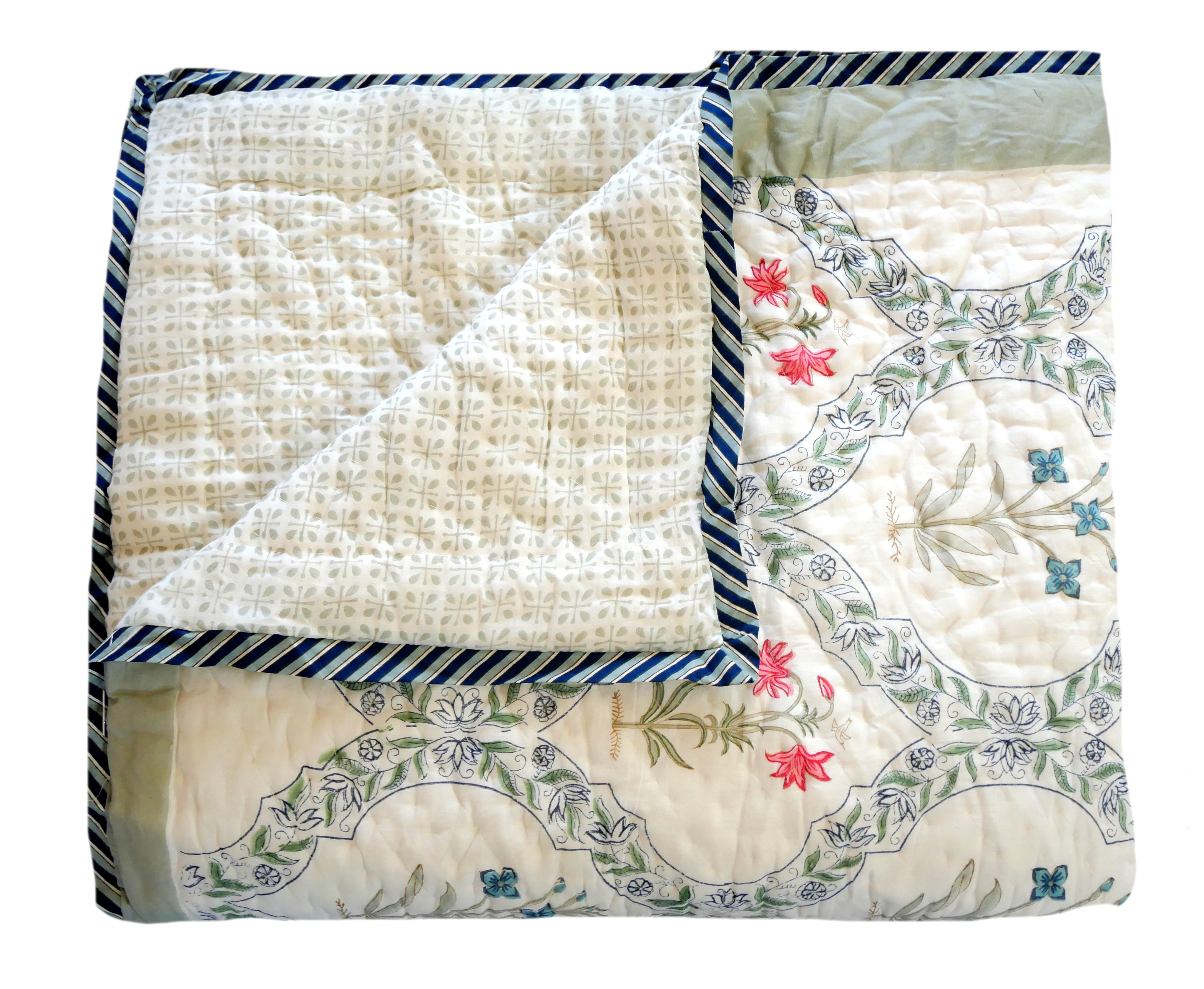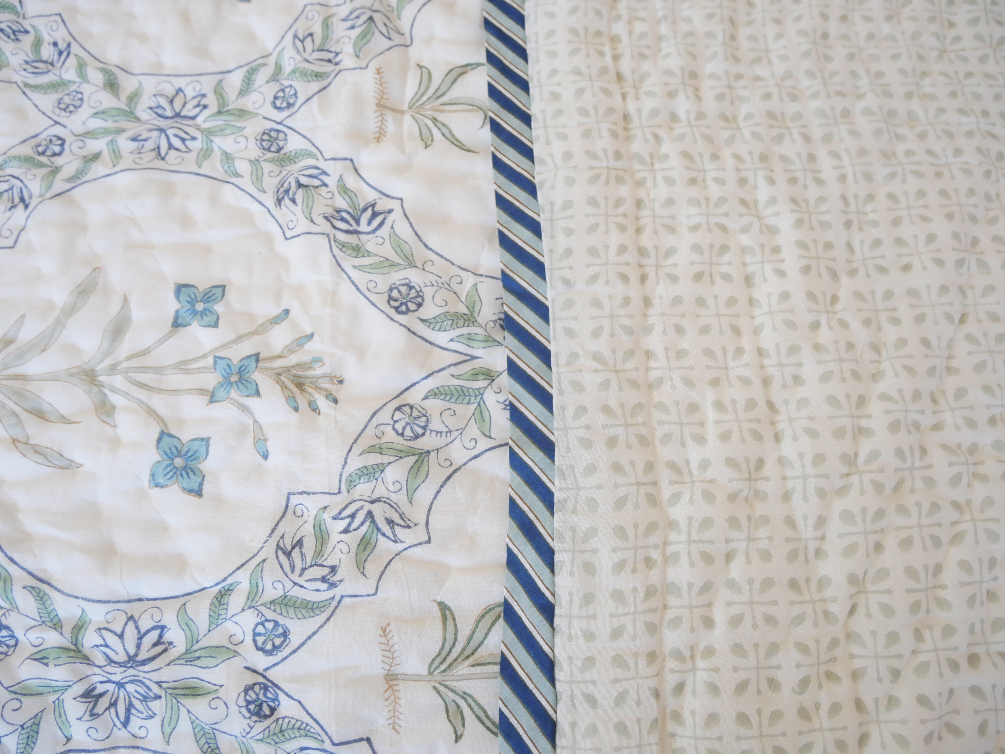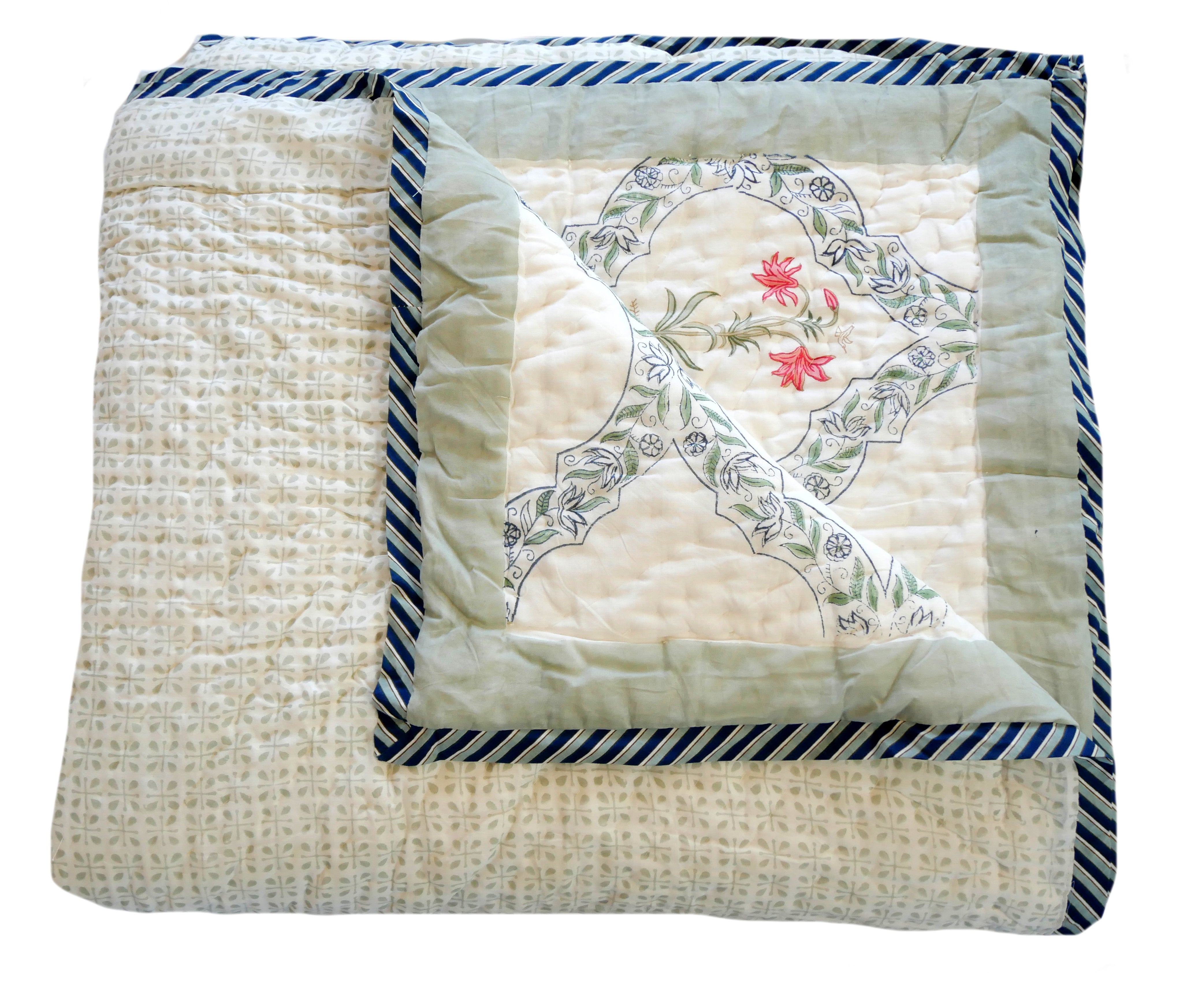 The quilt is elaborately hand printed on both sides in various patterns in typical designs from Rajasthan and can therefore be rotated as shown in our photos.