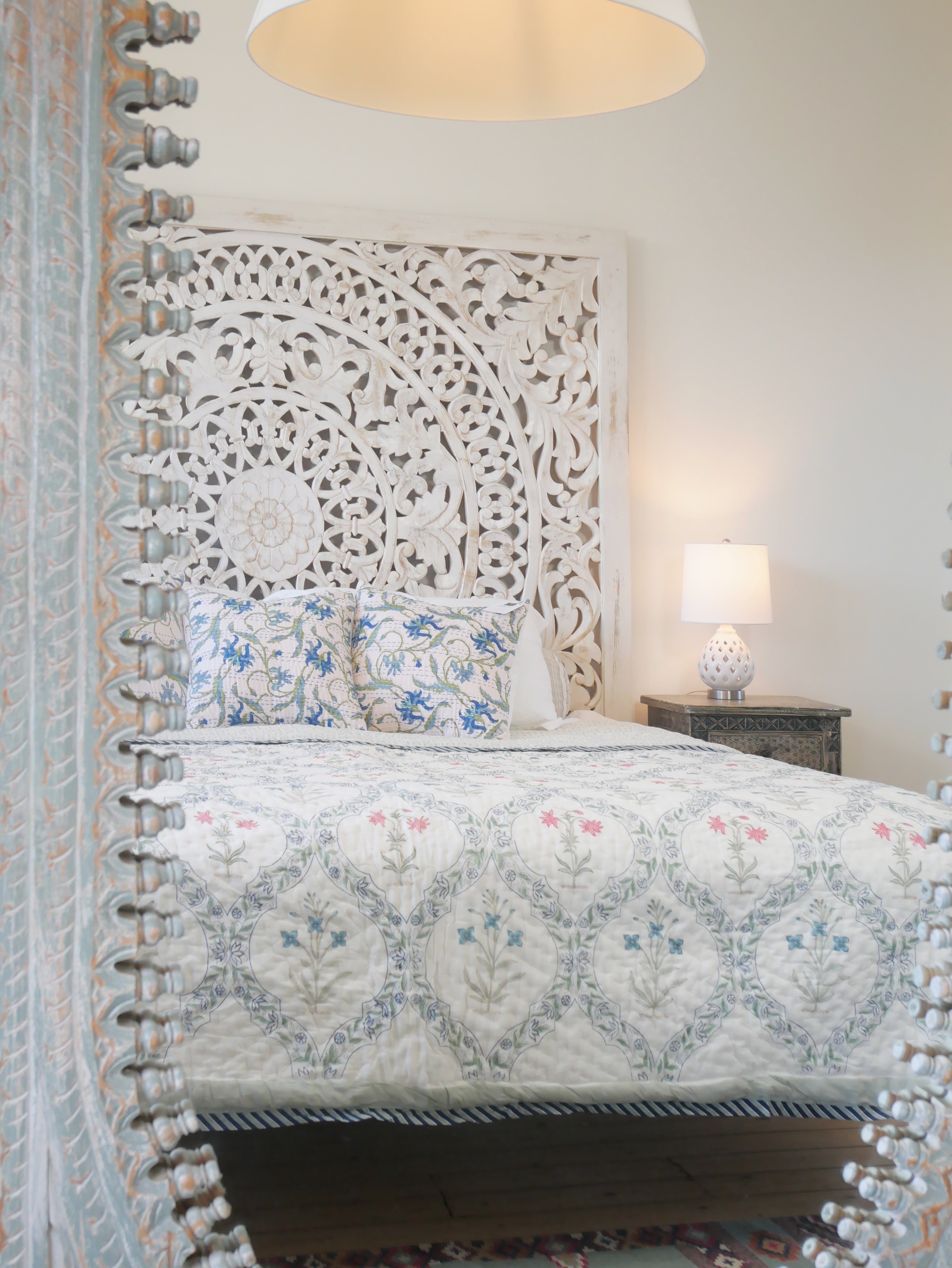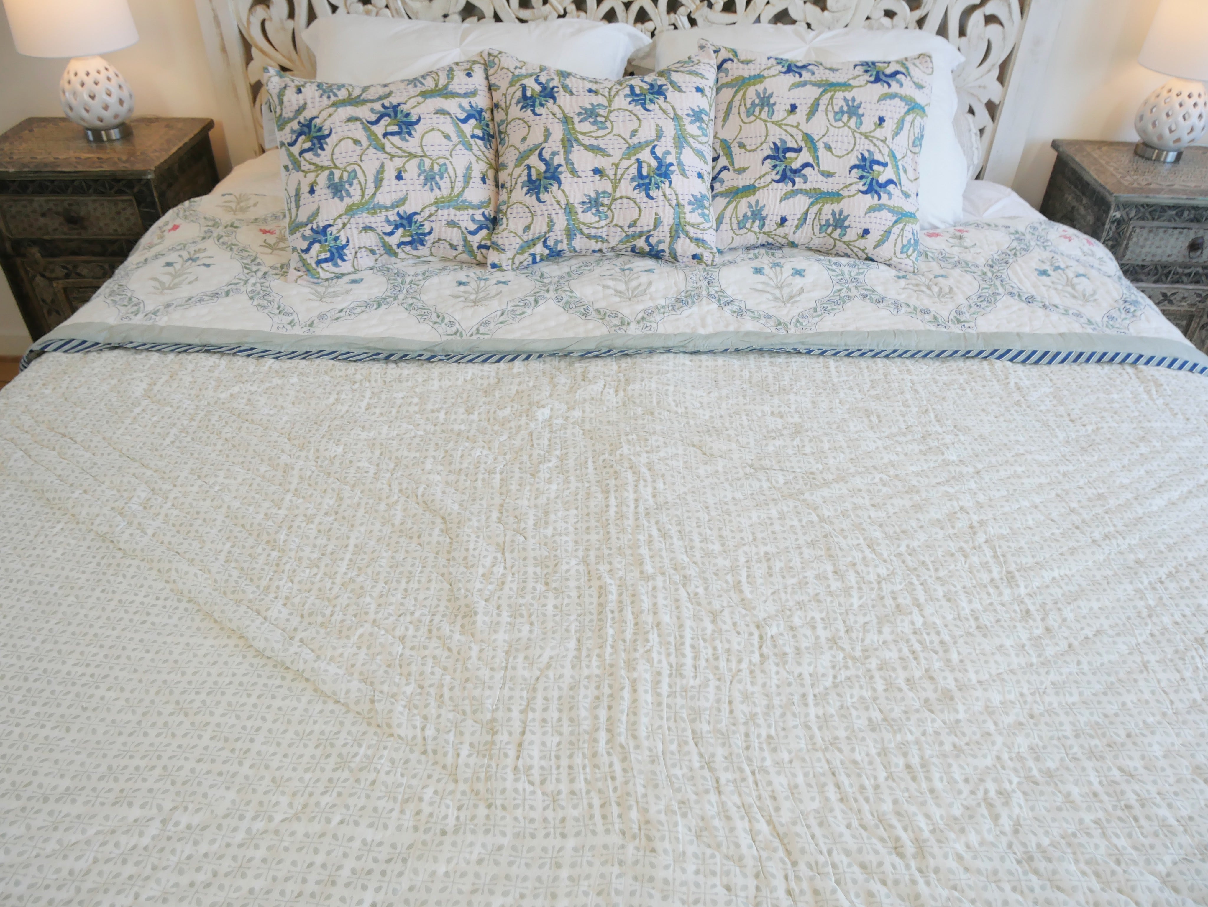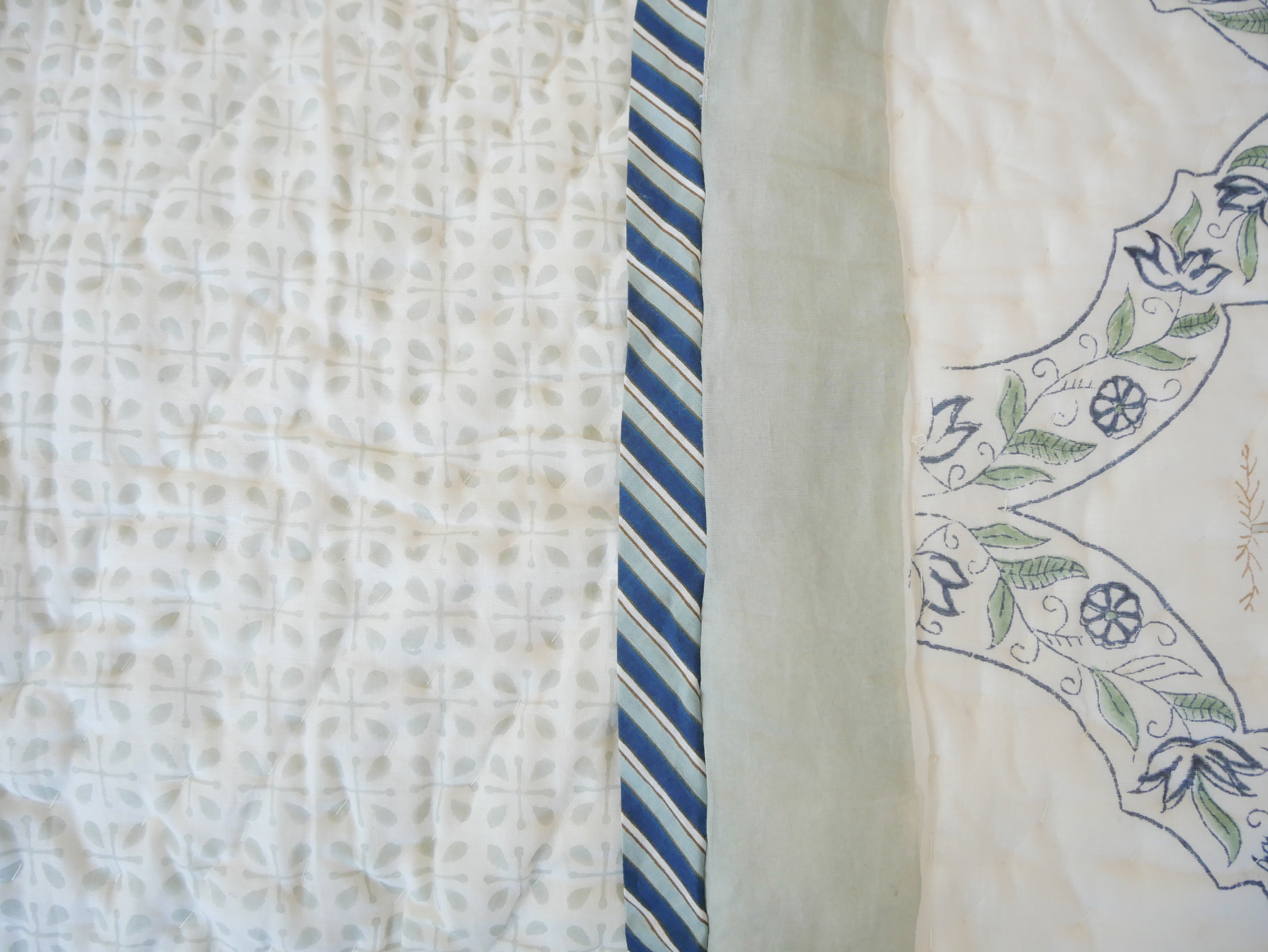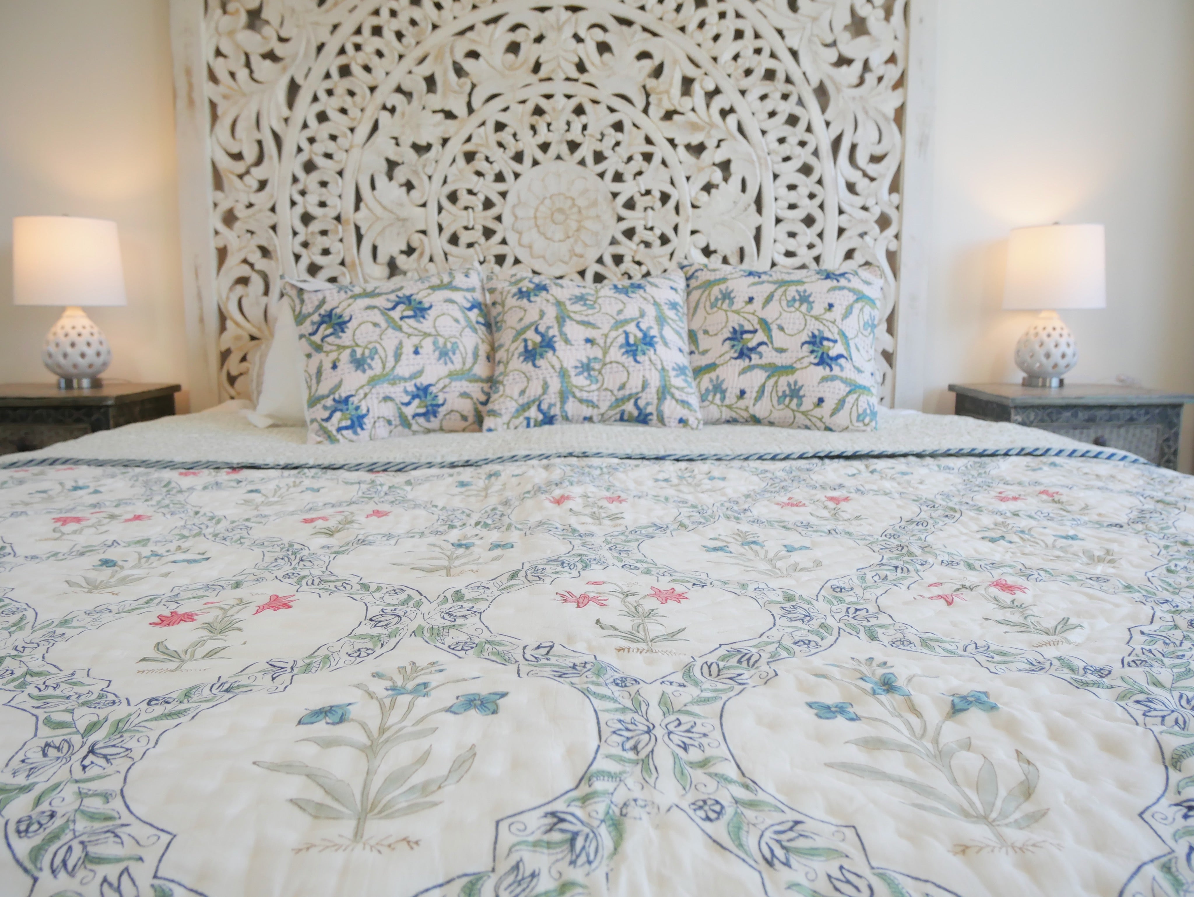 The quilt is elaborately hand printed on both sides in various patterns in typical designs from Rajasthan and can therefore be rotated as shown in our photos.