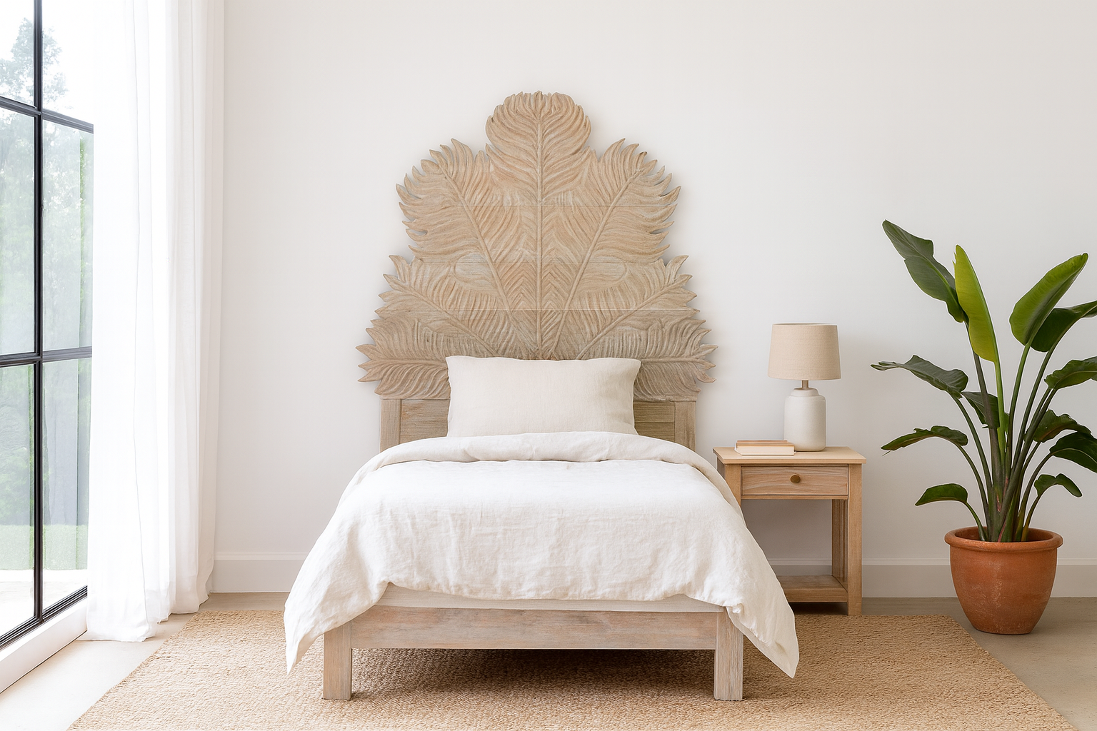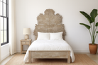 The oversized headboard features a sweeping palm leaf motif, meticulously hand-carved by artisans to highlight the natural beauty of mango wood. As part of our refined collection of hand carved wooden beds, Farn is ideal for those seeking unique, sustainable, and nature-inspired sleep spaces.